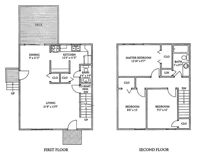 Living: 18’-1” x 13’-5” • Dining: 8’-11” x 11”-1’ • Kitchen: 12’-7” x 8’-2” • Powder Room: 3’-0” x 5’-4” • Bathroom: 5’-0” x 9’-8” • Bedroom #1: 9’-2” x 11’-11” • Bedroom #2: 8’-6” x 11’-11” • Master Bedroom: 13’-9” x 9’-8”