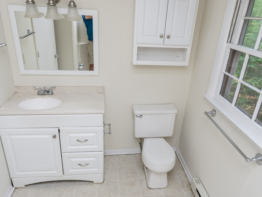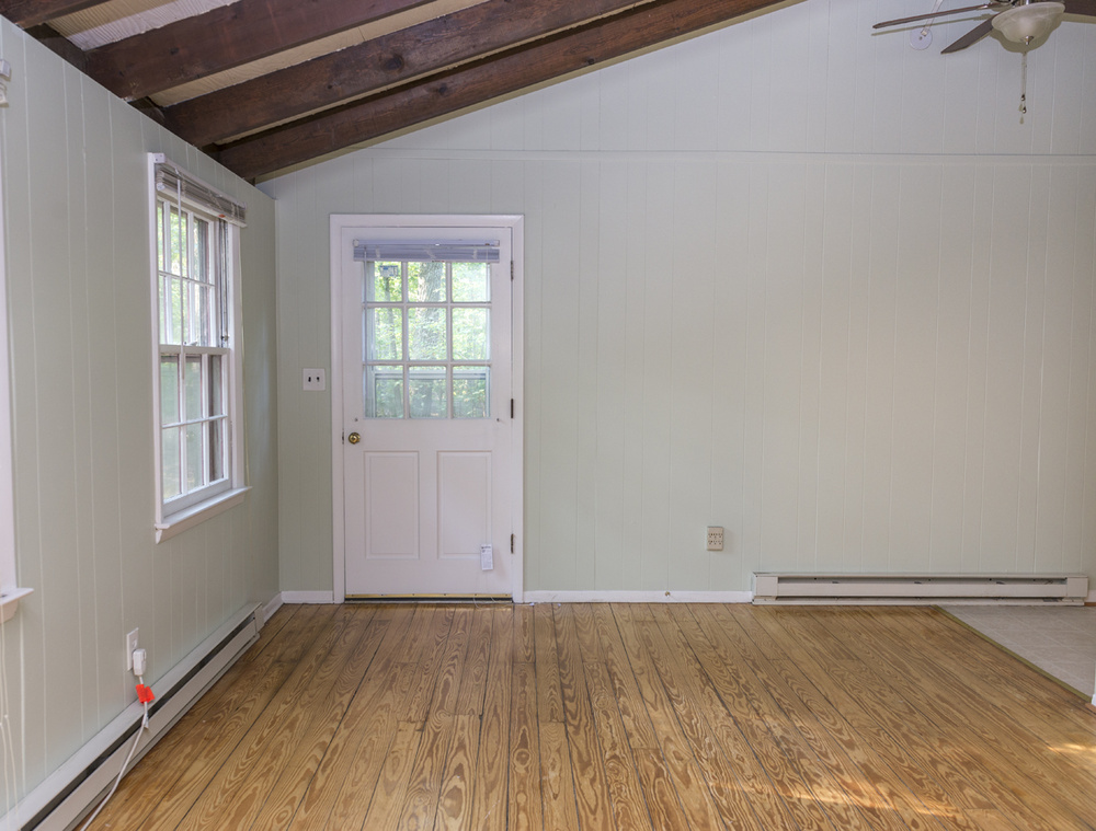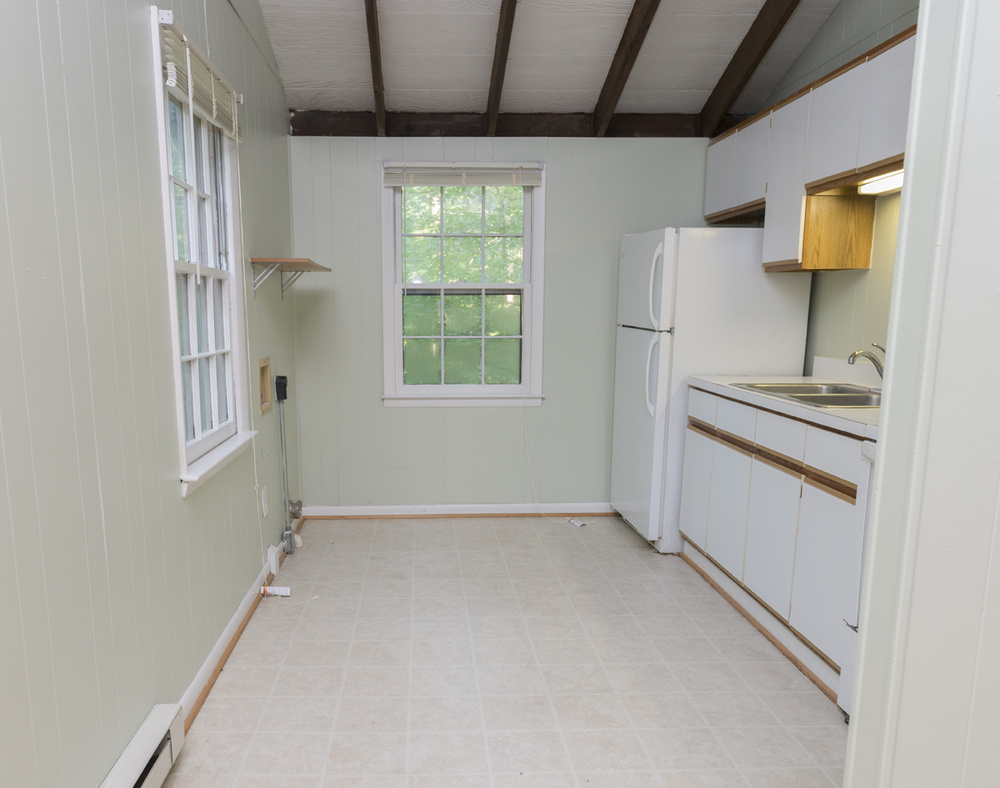 The recently updated bathroom and kitchen give Cottage H a modern cabin feel! A newly installed ceiling fan as well as window AC units keep the apartment cool and comfortable when desired. There is gorgeous pine wood flooring throughout the home, and a charismatic cathedral ceiling gives off a spacious and rustic atmosphere. Additionally, a wood burning fireplace compliments the ambiance and supplements the baseboard heating. The expansive wooden deck out back provides the perfect place to enjoy the impressive terrain.