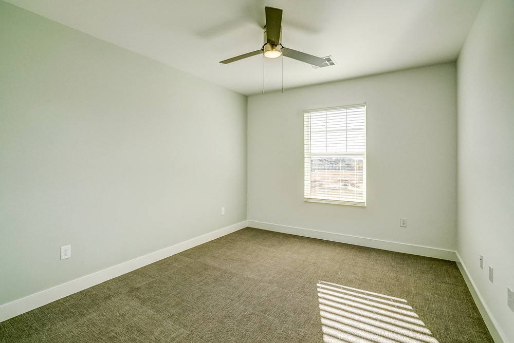 · Bedrooms (one or two per unit plan) feature carpet and ceiling fans.