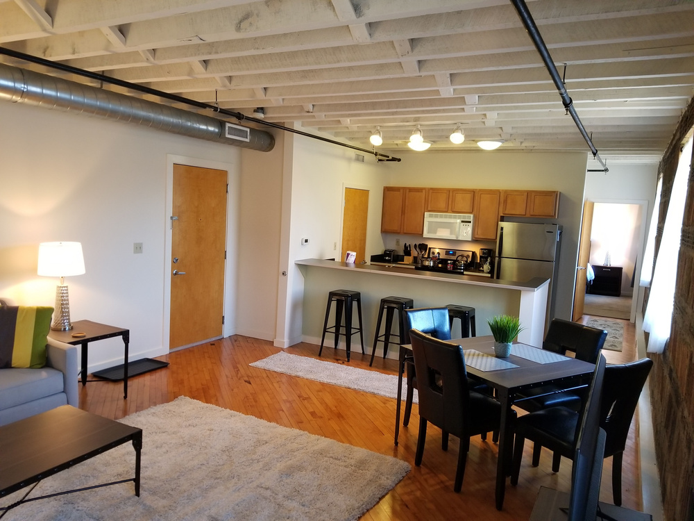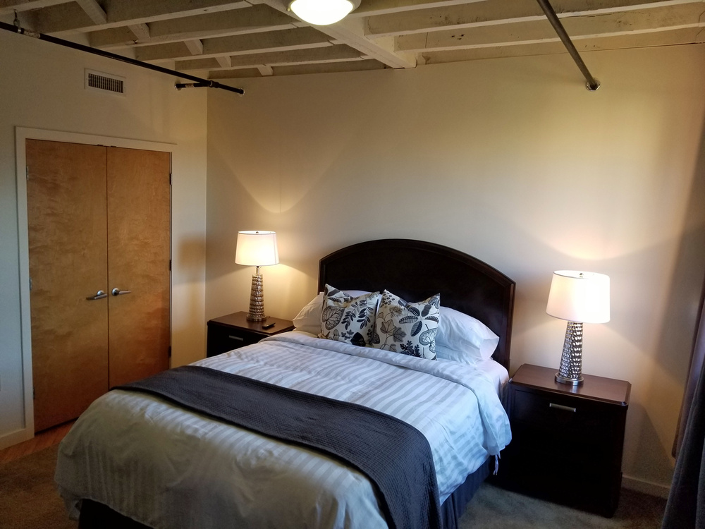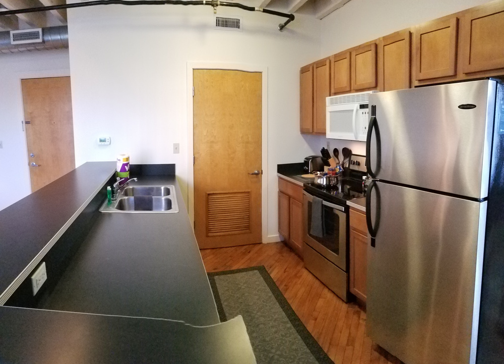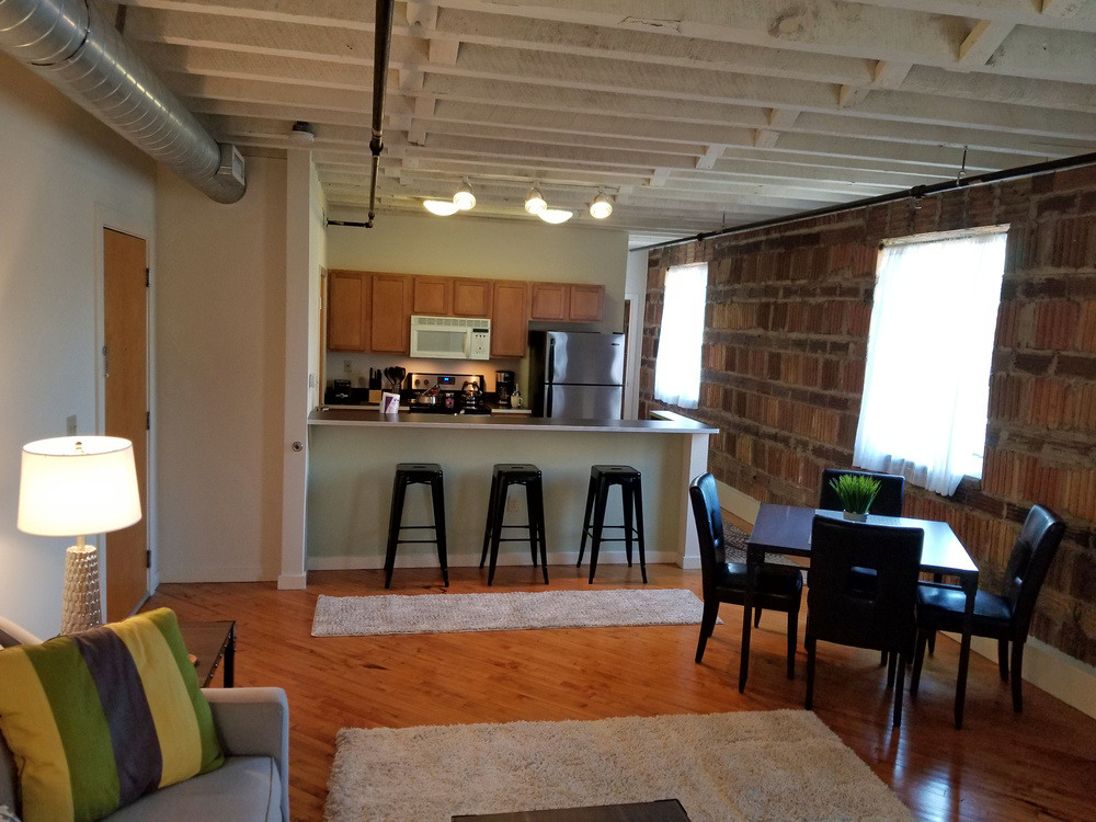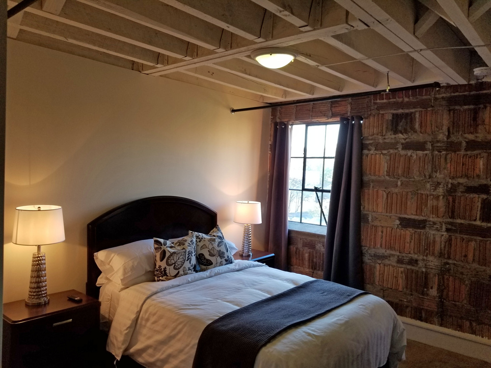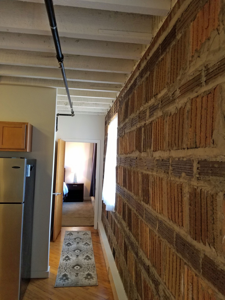 2nd floor 1 bedroom flat in Phase I, the original warehouse, $1845. The Flat Car has 9’ ceilings, clay tile walls, exposed beams, original hardwood flooring and transom windows! Since it is on the top floor, the exposed ceiling beams are the original dark brown. It is very sunny and faces south!