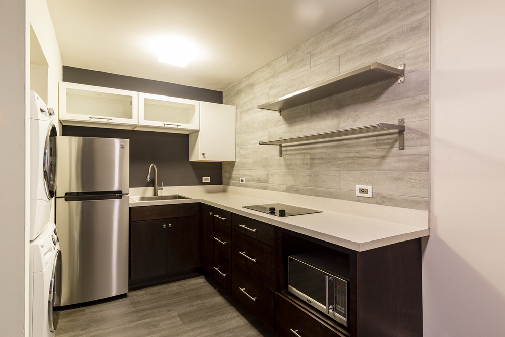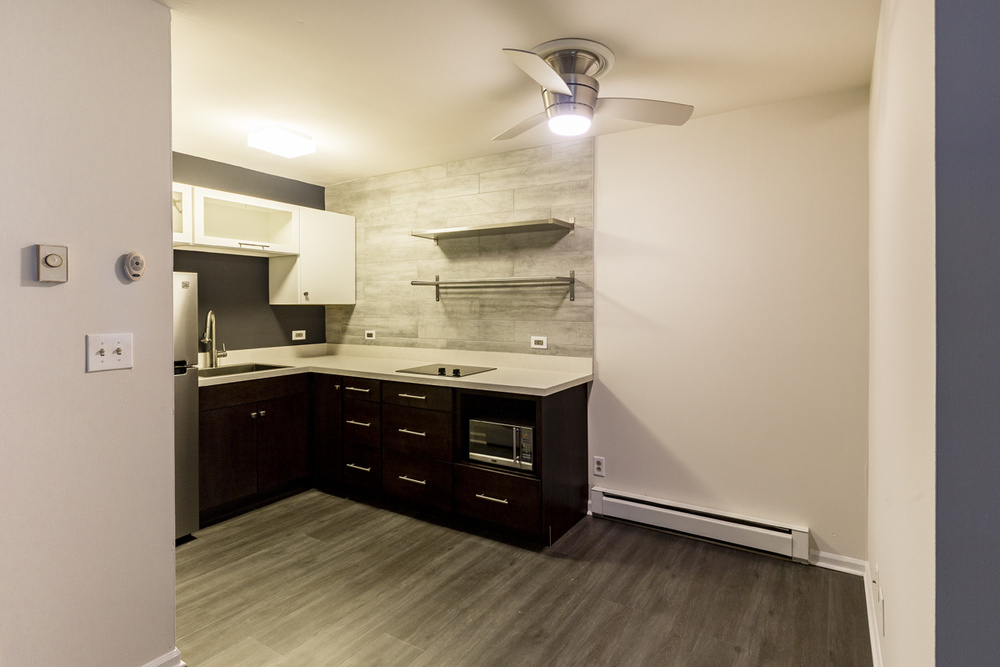 Apartment Description: Newly Renovated One-Bedroom Apartment – Featuring sleek stainless steel appliances, espresso cabinetry, a tiled kitchen backsplash, and dark wood plank flooring.